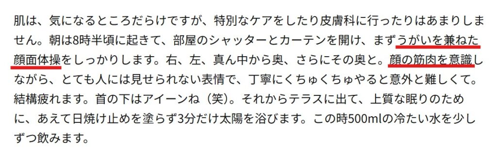 「美ST」に掲載されていた2023年9月更新のインタビュー記事を確認してみたところ、大地真央さんは顔面体操を毎日継続させていて、顔の筋肉を鍛えていることが分かりました。