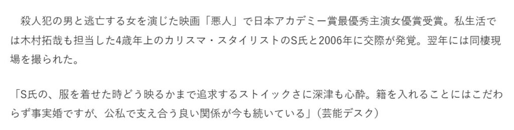 深津絵里さんは結婚していませんが、スタイリスト・白山春久さんが事実婚状態の旦那だと噂されています。