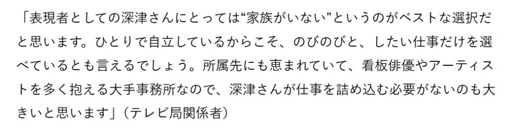 一方、深津絵里さんは「表現者」という立場を大切にしているため、あえて結婚せず、子供も授からないという姿勢を貫いているそうです。