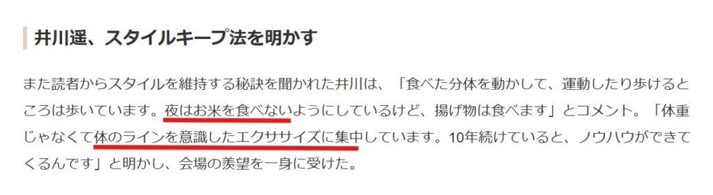 - 綺麗な秘訣は「夜にお米を食べず、運動を継続する」こと