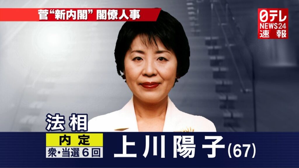 コロナ禍の真っ只中だった2020年、安倍晋三さんから菅義偉さんに総理が交代しましたが、上川陽子さんは菅内閣でも引き続き法務大臣を務めることになります。