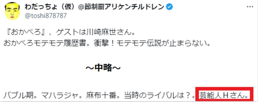 2024年8月に関西テレビ制作のトーク番組「おかべろ」に川崎麻世さんが登場した際、「芸能人H」が若い頃のライバルだったと打ち明けていました。