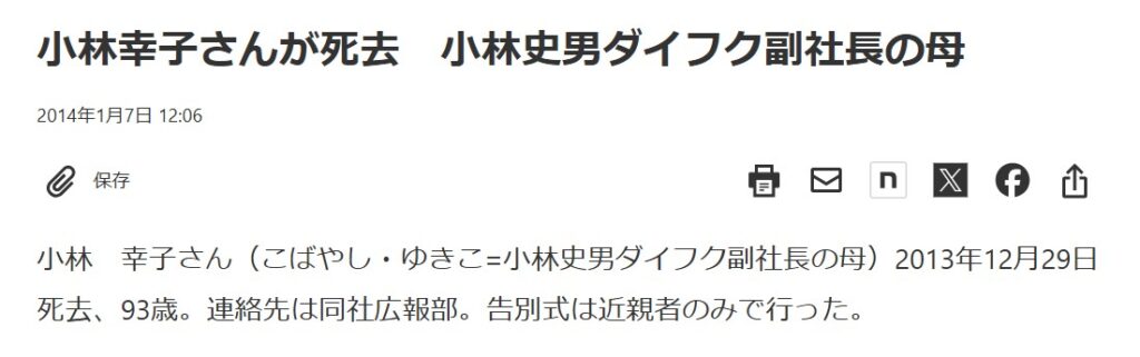 「小林幸子 死因」と検索される理由は同姓同名の小林幸子さん(ダイフク副社長の母)が93歳で亡くなっていたからです。