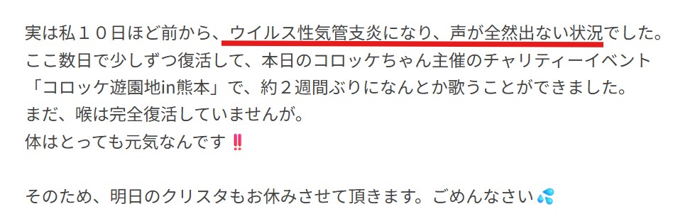 一方、小林幸子さんは2024年4月に「ウイルス性気管支炎」を患った過去があるので、病気をしていた?という噂は本当です。