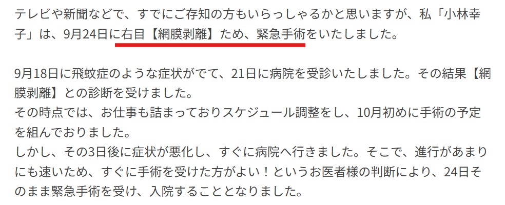 また、小林幸子さんは2019年9月に「網膜剝離」の手術を受けていたことも判明しています。