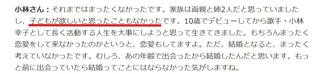 元々、小林幸子さんは結婚願望が強くなく、子供を欲しがるタイプではなかったことが「CHANTO WEB」のインタビュー記事で判明しています。