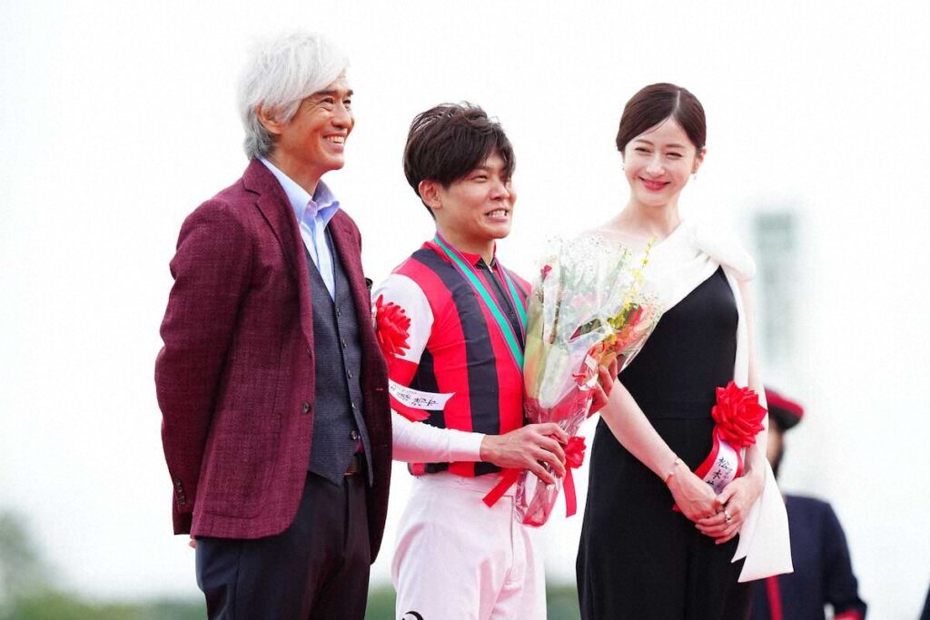 白と黒のエレガントなドレスを身にまとい、悲願のG1初制覇を果たした三浦皇成騎手の勝利を称えていました。
