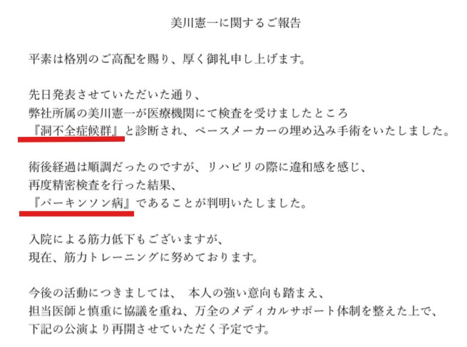 2025年11月13日、公式インスタにて「パーキンソン病」と「洞不全症候群」を患っていることを打ち明け、声明文を公開していました。