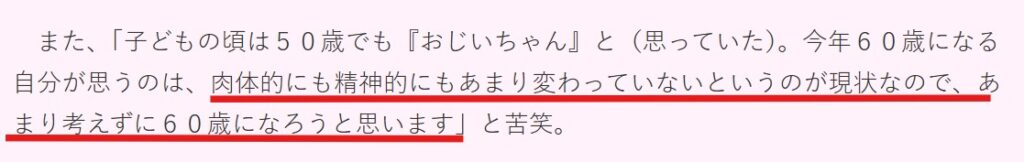 「未来少年コナン」の舞台に出演した際、還暦間近だった椎名桔平さんは「あまり考えずに60歳になろうと思います」と語っていました。